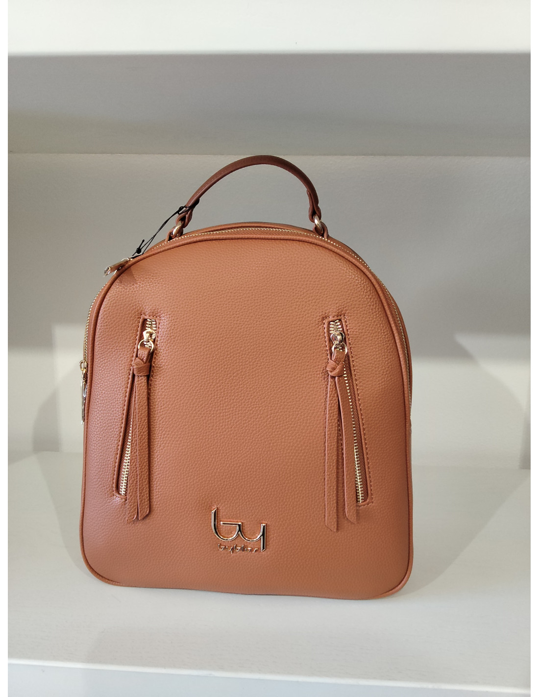 Zaino bybyblos con doppia tasca anteriore. In ecopelle martellata nero e cuoio. Per la sua capienza è adatto anche per il lavoro oltre che per il tempo libero.